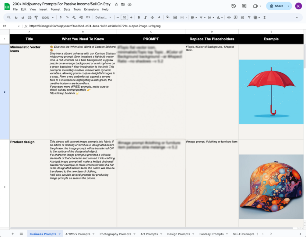 Each Midjourney prompt in the collection is crafted to inspire excellence and efficiency in content creation. THE LINK TO YOUR CUSTOMIZABLE MIDJOURNEY PROMPTS SPREADSHEET IS INCLUDED ON THE FIRST PAGE OF YOUR PDF.